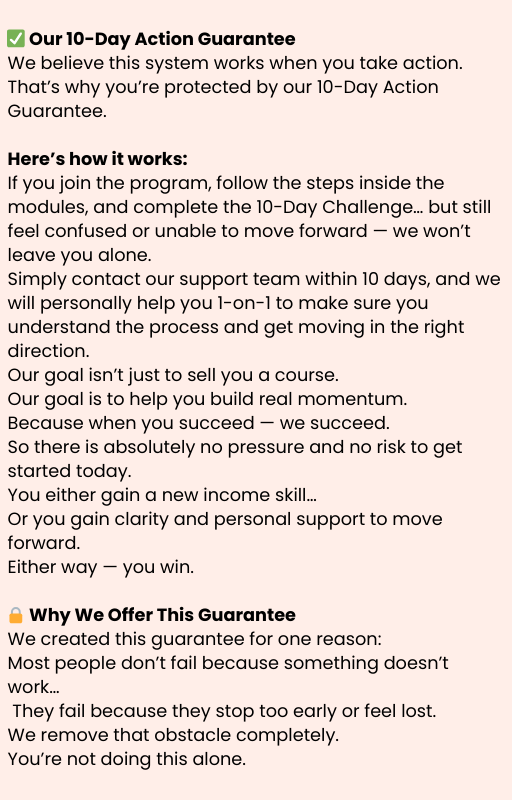 If you join the program, follow the steps inside the modules, and complete the 10-Day Challenge… but still feel confused or unable to move forward — we won’t leave you alone.